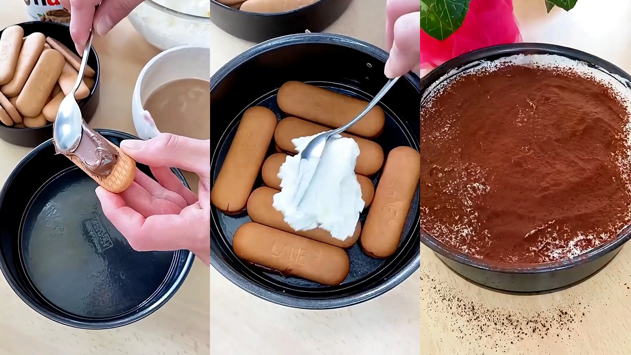 Începem prin a pregăti pișcoturile: acestea se lipesc două câte două folosind un strat generos de Nutella. După ce au fost lipite, se trec rapid prin amestecul de lapte cu cacao și se așază uniform pe fundul unei forme de tort detașabile.